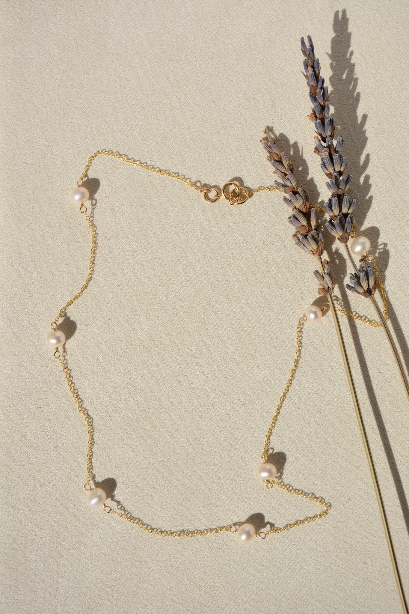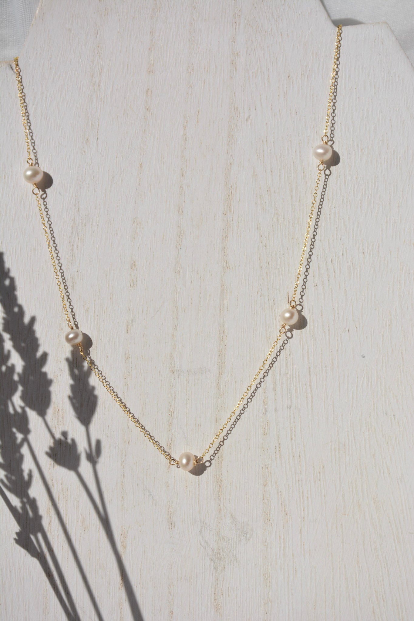 Hand-made dainty necklace. Made with gold-fill chain and freshwater pearls. This necklace is also offered in sterling silver.