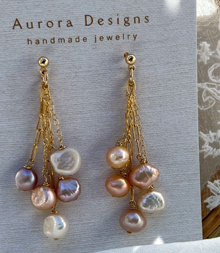 A beautiful variety of gold-fill chains paired with various shapes of pink and white freshwater pearls.