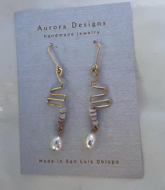 Handmade gold-fill wire earrings paired with beautiful pink stones and freshwater pearls. Only 1 pair is available due to uniqueness.